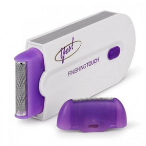 El removedor de pelo YES By Finishing Touch es un eliminador de cabello instantáneo y sin dolor. Cuenta con batería de iones de litio recargable. Después de cargar el dispositivo, presione el botón púrpura para usarlo. Al reemplazar la cuchilla, continúe presionando el pequeño botón blanco en la cabeza y dé a la cabeza un giro de 90 grados.